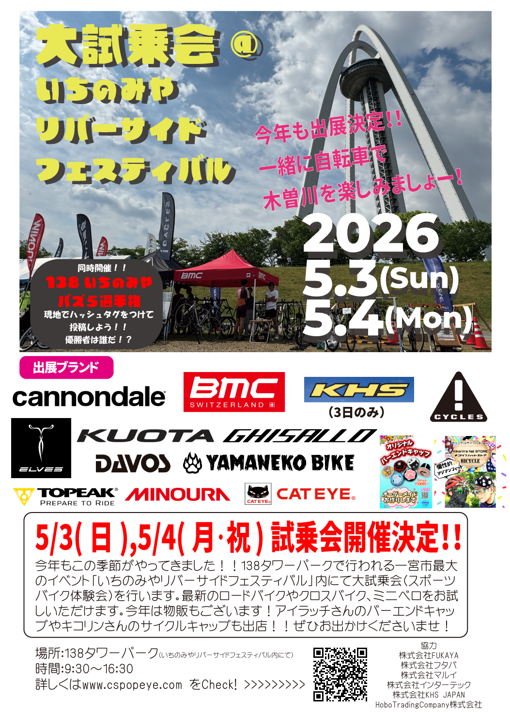 来たる5/3、5/4に138タワーパークにて行われる一宮市最大のお祭り、いちのみやリバーサイドフェスティバルにサイクリング、ポタリング体験として参加いたします!